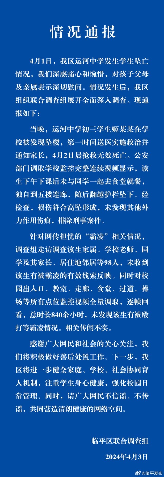 央视网消息:据@临平发布 微博消息,4月1日,杭州临平区运河中学发生学生坠亡情况,深感痛心和惋惜,对孩子父母及亲属表示深切慰问。情况发生后,临平区组织联合调查组展开全面深入调查。现通报如下: