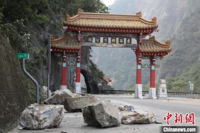 4月4日下午,因强震受困于花莲太鲁阁台8线中横公路隧道内的30多名酒店员工,陆续获救。图为地震发生后的太鲁阁公园“东西横贯公路”牌楼,靠山体一侧道路落满大石。中新社记者 杨程晨 摄