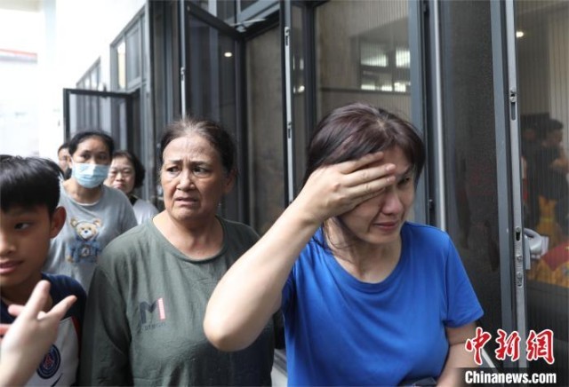 4月4日下午,因强震受困于花莲太鲁阁台8线中横公路隧道内的30多名晶英酒店员工,陆续获救。图为受困者陈卫华的家属,她见到安全获救的丈夫忍不住哽咽。中新社记者 杨程晨 摄
