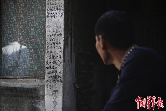 4月16日,山西代县,帅秀平在院子里看张福青晚年写在墙上的字。