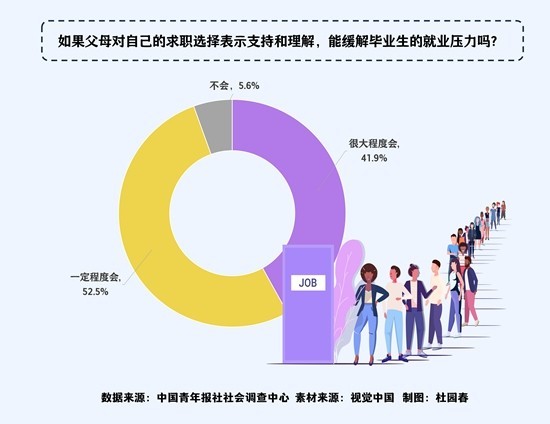 如果父母对自己的求职选择表示支持和理解,94.4%的受访应届毕业生直言能够缓解自己的就业压力,超四成(41.9%)表示很大程度上会。