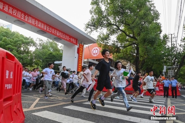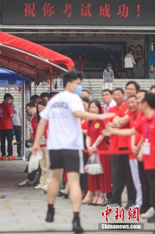资料图:湖南省2023年高考结束,考生步出考场与亲友庆祝。中新社记者 杨华峰 摄