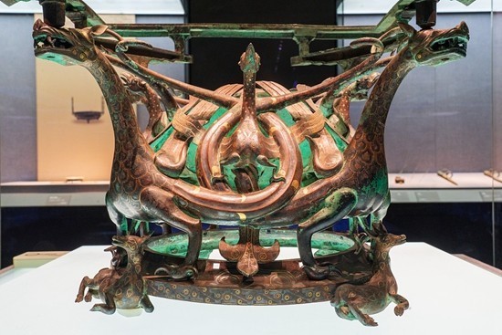 河北博物院陈列的中山国王陵文物,错金银四龙四凤方案座。视觉中国供图