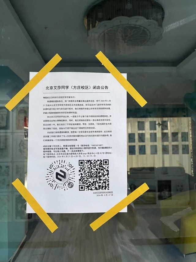 北京艾莎同学方庄店门口张贴的闭店通知显示,2024年5月27日起对北京艾莎同学方庄校区正式实施闭店,即日起会对门店所有学员的剩余课时进行统计并与各位核对,“我们将竭尽所能让所有学员得到顺利安置并最大程度地确保所有学员的课时权益”。