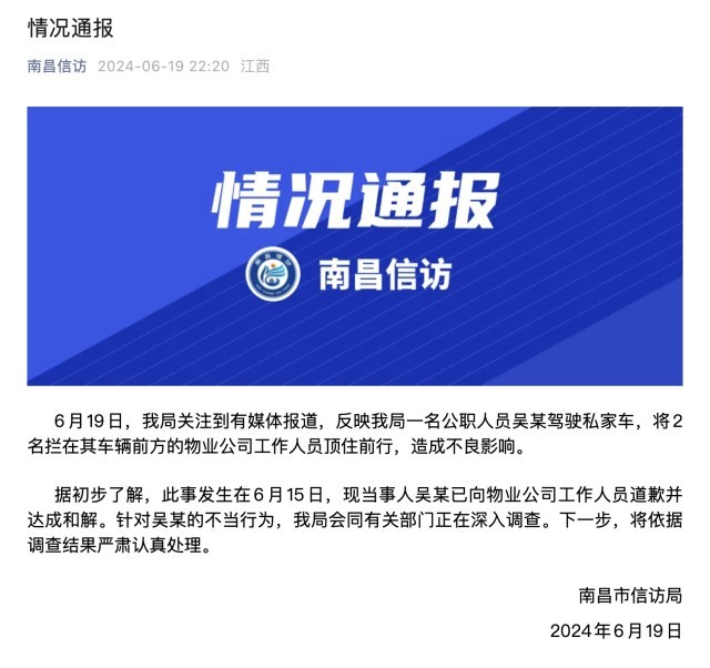 6月19日晚,南昌信访局发布情况通报:据初步了解,此事发生在6月15日,现当事人吴某已向物业公司工作人员道歉并达成和解。针对吴某的不当行为,南昌信访局会同有关部门正在深入调查。下一步,将依据调查结果严肃认真处理。