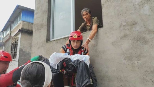 6月19日,消防员和医护人员在桂林市七星区东江军休所营救91岁老人。桂林市消防救援支队供图