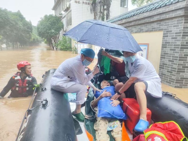 6月19日中午12时,在七星区的东江军休所,一名91岁老人因家中停电无法吸氧,急需转移。离老人最近的救援小分队队长杨东升接到警情后,顾不得连续作战的疲惫,立即赶往老人所在的区域。他意识到,自己晚一秒到,老人就多一分危险。到场后,在医护人员的配合下,大家小心地将老人抬下楼,随后利用橡皮艇把老人转移到安全区域,移交给现场医护人员。