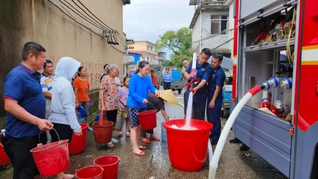 受洪峰影响,桂林市七星区部分区域断水断电,6月20日,消防队员利用消防车先后深入龙门中心校、卫家渡村及马坪社区等地送水,以解群众燃眉之急。