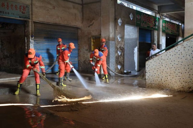 永福县消防救援大队消防员们在清理西江市场的淤泥。周可国/摄