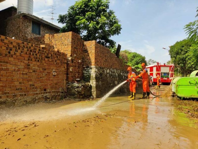 雁山区消防救援大队消防员正在清理村道淤泥。桂林消防救援支队供图