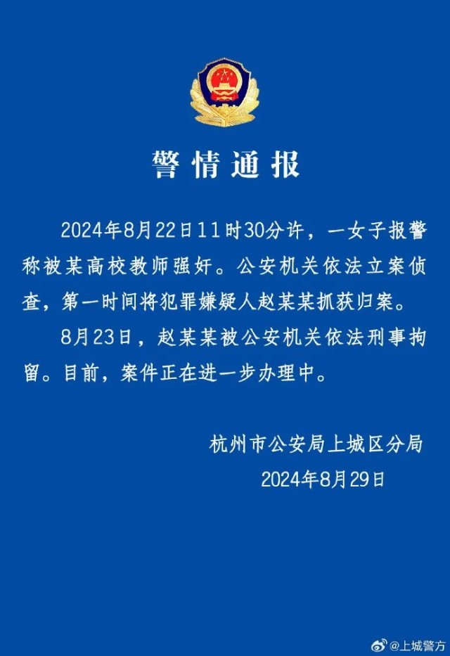 8月29日19时许,@中国美术学院 发布通报称,近日,我校教师赵某某涉嫌违法犯罪,属地公安机关正对其进行立案调查。学校将从严处理,决不姑息,处理结果将及时向社会公布。