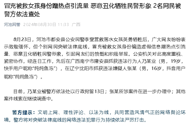 8月23日,广西河池市都安县公安民警李燮营救落水女孩英勇牺牲后,广大网友纷纷表示致敬缅怀。期间,短视频平台出现账号“纯纯鱼冻”,自称其是被救女孩,并发布恶意P图丑化牺牲民警李燮的图片,同时发表不当言论,引发网民愤慨。8月30日,“河池网警”官方公众号发布消息,先后抓获两名涉嫌假冒被救女孩的恶意造谣者。根据通报称,“纯纯鱼冻”系个别网民突破法律底线,冒充被救女孩身份编造虚假信息蹭热点引流量、恶意丑化牺牲民警形象。公安机关对此高度重视、紧密协作,经连日工作,先后在广西南宁市隆安县抓获违法行为人乃某业(男,19岁,快手用户昵称“纯纯鱼冻”),在辽宁沈阳市抓获违法嫌疑人张某(男,16岁,抖音用户昵称“纯纯鱼冻”)。