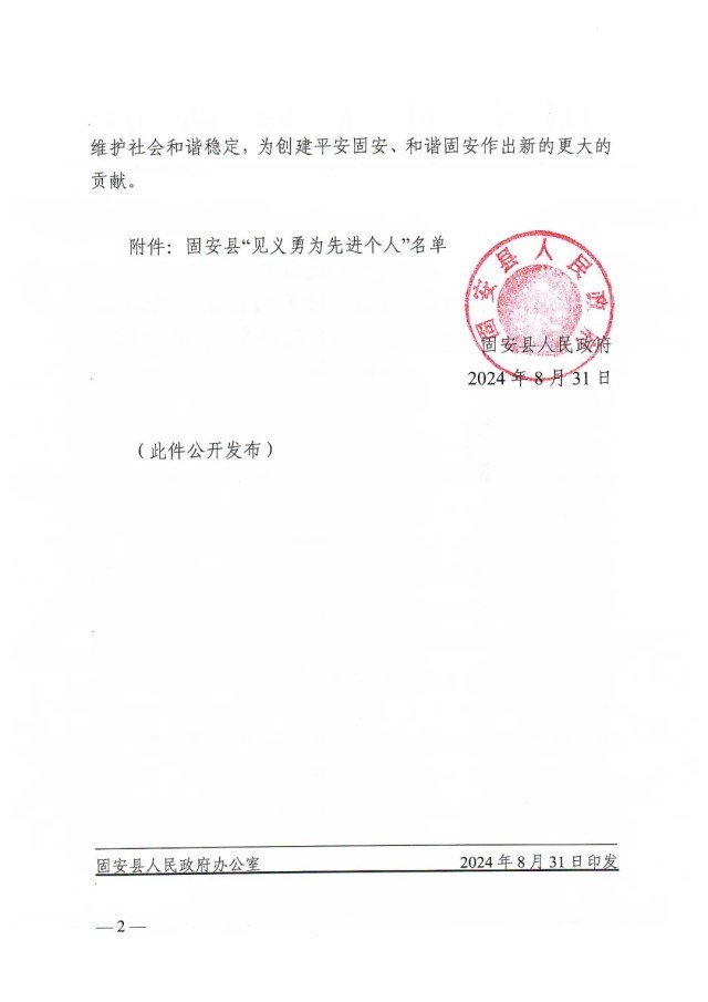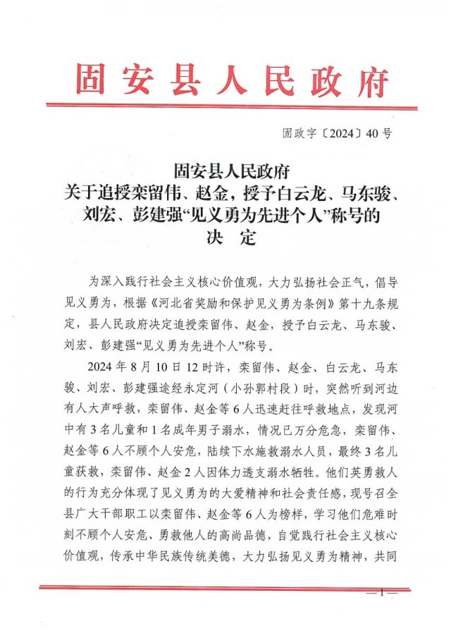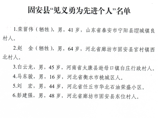 今天,河北固安县人民政府网站发布公示,追授栾留伟、赵金,授予白云龙、马东骏、刘宏、彭建强6人“见义勇为先进个人”称号。