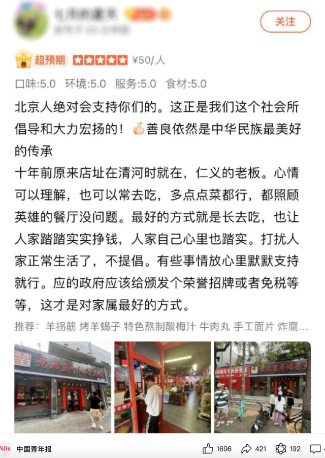 据报道,山东泰安41岁的栾留伟救人事迹传开后,他生前在北京开的火锅店排起长队。