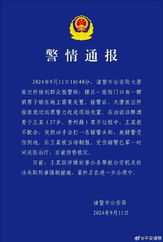 央视网消息:浙江诸暨警方通报,9月11日1时40分,诸暨市公安局大唐派出所接到群众报警称:辖区一旅馆门口有一醉酒男子躺在地上需要处置。接警后,大唐派出所指派就近巡逻警力赶赴现场处置。在劝说该醉酒男子王某(27岁,贵州籍)离开过程中,王某拒不配合,突然动手击打一名辅警头部,致辅警受伤倒地。后王某被当场制服。受伤辅警已第一时间送医治疗,目前伤势稳定。目前,王某因涉嫌妨害公务罪被公安机关依法采取刑事强制措施,案件正在进一步办理中。
