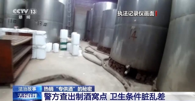 在查处基酒生产、调配、灌装的一处窝点时,警方发现,这里的生产条件可谓是脏、乱、差。在这里,房间布满灰尘,一些酒桶及灌装工具随意在各处摆放,生产人员会按需将基酒从这些储酒罐中抽出,转移到白色的塑料桶里。现场生产环境堪忧,而所谓的“专供酒”正是在这样的环境中被生产出来的。