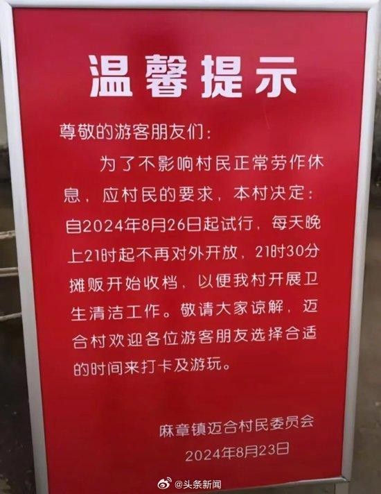 此前当地网友发布的一张迈合村村委会通知显示,为了不影响村民正常劳作休息,应村民的要求,自2024年8月26日起试行,每天晚上21时起不再对外开放,21时30分摊贩开始收档,以便该村开展卫生清洁工作。