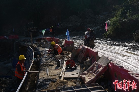 8月31日,湖南资兴,通往燕窝村的路上,工程队正在抢修被山洪掏空的路基。