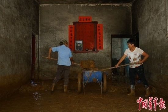 8月24日,湖南资兴,州门司镇杨公塘村村民正在家中清理淤泥。