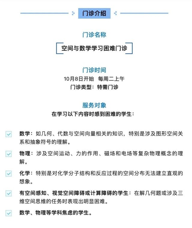 上海儿童医学中心患者服务公众号发布的“门诊介绍”显示,该门诊将会服务于对学习以下内容感到困难的学生:在数学上,如几何、代数与空间向量相关的知识,特别是涉及图形空间关系和抽象符号的理解;在物理上,涉及空间运动、力的作用、磁场和电场等复杂物理概念的理解;在化学上,特别是对化学分子结构和反应过程的空间分布无法建立直观的想象;在有空间感知、视觉空间障碍或计算障碍的学生,在解几何题或涉及三维空间思维的任务时表现出明显困难。