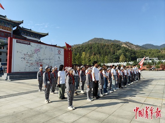 9月25日,湖北郧西县革命烈士纪念馆,参与2024年“青春无限好 浪漫郧西见”——青年喜爱的旅游目的地寻访活动的大学生和当地红军小学的师生共同参与爱国主义教育活动,重温入队、入团誓词。中青报·中青网见习记者 李怡蒙/摄