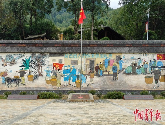 9月22日,郧西县关防乡丁家坪村红二十五军223团政治部旧址墙上的彩绘。中青报·中青网见习记者 李怡蒙/摄