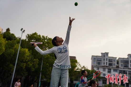 11月2日,湖北京山,京山实验小学的周末网球兴趣班上,六年级的张钦珞在练习发球。她从小学一年级就开始学网球。京山的65万常住人口中有10万余名网球爱好者,全市3520平方公里内有高标准网球场340余片,是全国网球万人场地设施比和普及率最高的城市。今年夏天中国选手郑钦文夺得巴黎奥运会网球女单冠军,许多人开始关注网球这项运动。全国各地的家长怀揣着“培养下一个郑钦文”的愿望,和孩子一起来到京山,追逐网球梦。