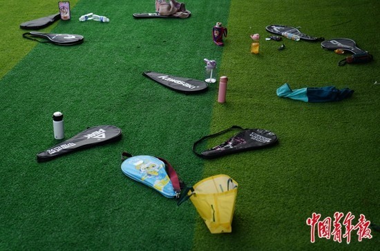 11月2日,湖北京山,京山实验小学,参加周末网球兴趣班学生的网球拍和水杯。大多数学生带了自己的网球装备,学校还配备了200多把球拍和给初学儿童用的海绵球,供没有装备的学生使用。