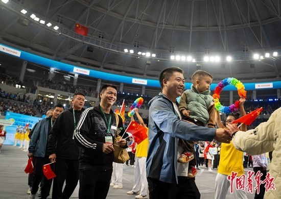 11月1日,湖北京山国际网球赛事中心,一名参赛运动员抱着自己不到两岁的儿子参加第五届中国(京山)网球节开幕式。2024年中国网球协会社区运动会全国总决赛暨中国村网(京山)为社区团体赛,包含12-30岁、31-50岁以及51岁以上3个年龄组别的双打比赛,最小参赛球员为13岁,最大参赛球员为62岁。