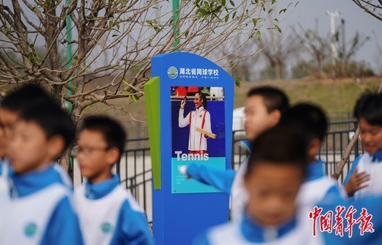 11月1日,湖北京山,新落成的湖北网球学校校园里,学生们走过中外网球名将的介绍牌,郑钦文被排在最靠前的位置。