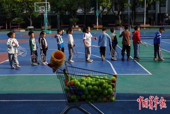 11月2日,湖北京山,京山实验小学的周末网球兴趣班上,低年级的小朋友排队等待练习球拍运球。这所学校的“网球进课堂”实践可以追溯到2008年。有特长的孩子可以入选校队,还会被网球学校“掐尖”,接受更专业的训练。