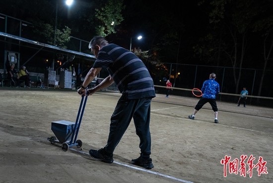 10月31日晚,湖北京山文峰公园,几名当地网球球友在有40多年历史的沙土球场打球。几轮比拼后场上的端线和边线都逐渐模糊,一名球友用石灰粉重新画线。