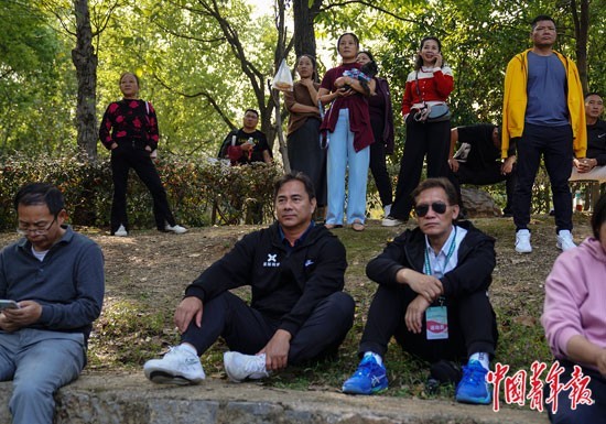 11月3日,湖北京山文峰公园,2024年中国网球协会社区运动会全国总决赛暨中国村网(京山)正在进行,市民们在一处山坡上观赛。