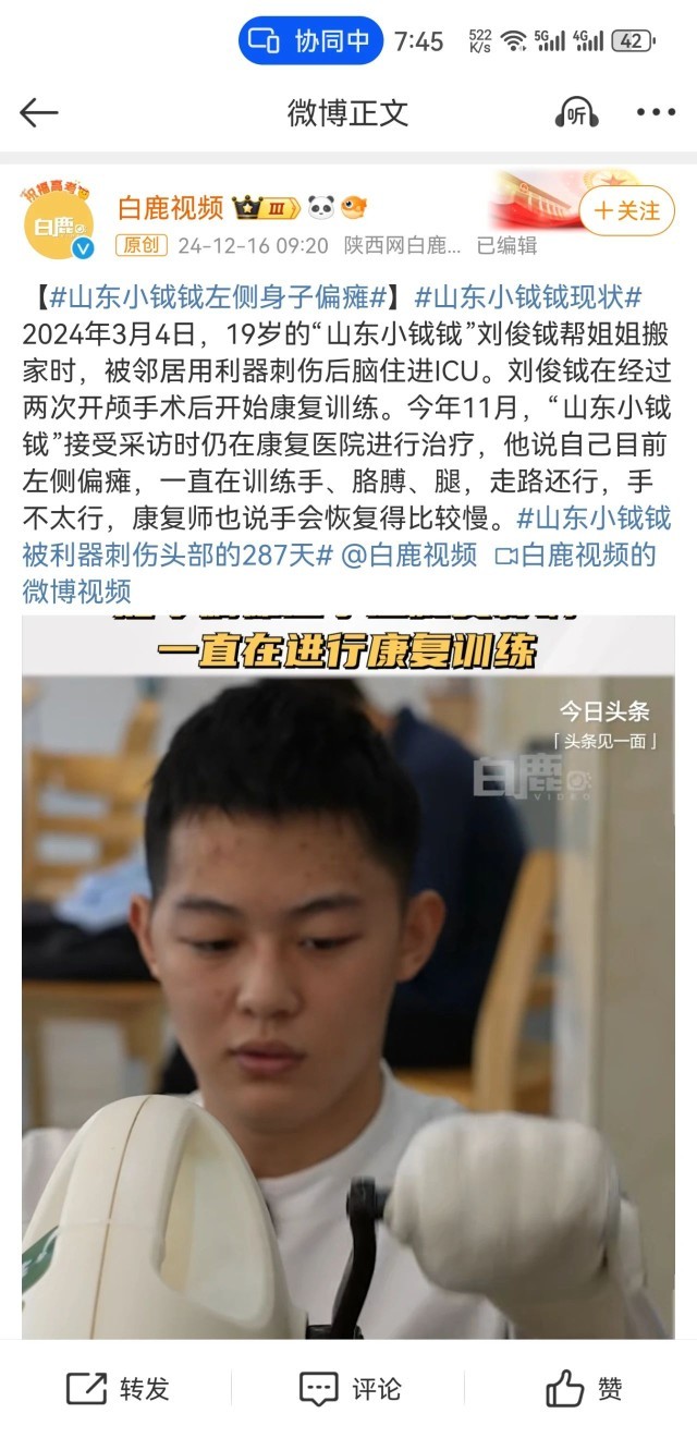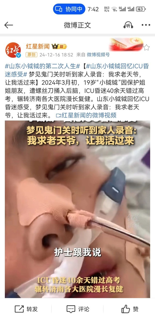据红星新闻报道,2024年3月初,19岁“小钺钺”被捅伤进ICU,昏迷40余天。他错过了今年的高考,辗转各大医院漫长复健。