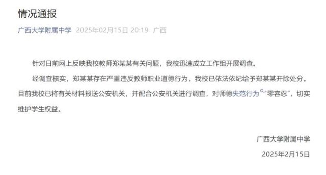 中国青年报客户端南宁2月15日电(中青报·中青网记者 谢洋)2月15日,广西大学附属中学发布情况通报称,针对日前网上反映该校教师郑某某有关问题,学校迅速成立工作组开展调查。经调查核实,郑某某存在严重违反教师职业道德行为,该校已依法依纪给予郑某某开除处分。