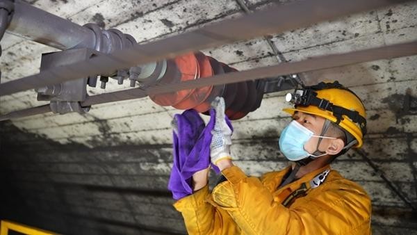 这一天,廖永信继续和卢定锋准时来到这里巡视,经过师傅耐心细致的指点和自己的深入钻研,廖永信已经有了很大进步。师徒二人打着手电缓步前行,时不时地蹲下查看底部供电设备的运行状态,熟练地将运行数据记录在随身携带的电子设备上。手电筒的强光仅能照亮脚下3米,堆积的矿砂在绝缘鞋底发出细碎的“沙沙”声。卢定锋看着成长不少的徒弟,心中一阵欣慰,又提醒道,“这里吸光严重,回声干扰大,咱们对话得打手势帮助理解。”卢定锋话音刚落,一阵轰鸣由远及近——黄兴钰等人正坐着接触网作业车行驶过来,一路排查隧道顶部的供电设备。