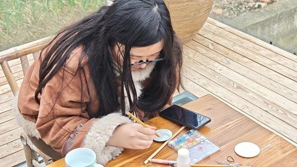 1月7日,她来到景德镇,停留了4天,后两天都在体验店画陶瓷盘子。王秉想给妈妈画一个蛇年盘子,于是设计了一个以红黑配色为主的小蛇女,笔触细致柔美,还使用了立体釉来表现珠子、飘带、烟雾。