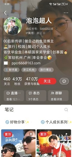 蓝天的师兄廖孔港是暨南大学新闻传播专业的一名研究生,他的小红书账号名为“泡泡超人”。