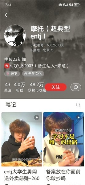 蓝天觉得,“作为一个传媒专业的学生,如果自己的账号能受到认可,是一种不一样的情绪价值。”蓝天说,他的一个同学,就是一名在小红书上有1万多粉丝的自媒体博主。