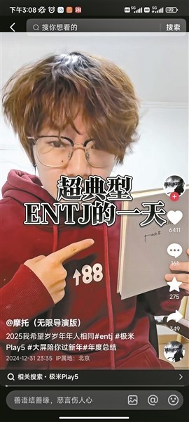 给刘坚印象最深的大学生博主有两个,分别是新闻学院2022级和2023级的学生。一个是热爱街舞的校街舞社社长,网名“甜辣小料”。在她的视频号上,首屏展示的九条视频里有五条是10万+。另一个是主打ENTJ人格(被认为有战略思维及大局观的人格)的学霸,抖音账号名为“摩托(无限导演版)”,抖音粉丝高达37.5万,账号内容主要是展示其极度自律、极具时间规划的日常。