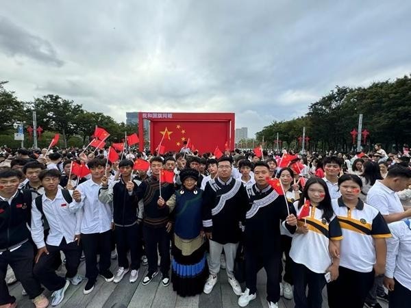 2024年国庆节,康凯的奶奶和班上孩子一起在宁波观看升国旗仪式。受访者供图