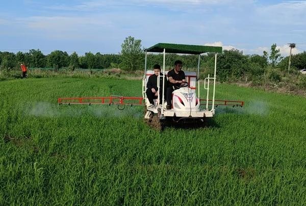 2024年7月,合肥市肥西县官亭镇团结村党委书记、村委会主任凌东升(左)和同事在水稻基地喷洒农药。受访者供图