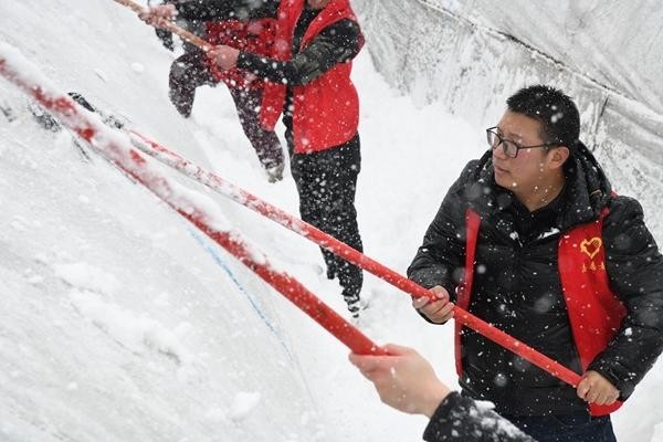 2022年2月,合肥市肥东县响导乡赵亮社区党总支书记、村委会主任赵军杰在村里果蔬产业园扫雪。受访者供图
