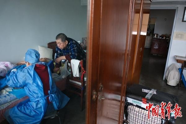 3月31日,北京市朝阳区一户民居里,上门护士高芳正在轻推一位87岁老人的身体,准备换药。老人在一个月前摔坏了髋关节,每3天就得换一次药,她所居住的老居民楼虽然有电梯,但电梯层跟楼层差半层,家门前的7级台阶成了“天堑”,只能请上门护士到家服务。