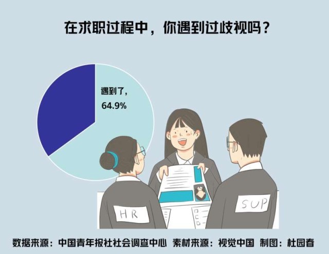 前不久,中国青年报社社会调查中心联合问卷网(wenjuan.com),对1333名应届毕业生进行的一项调查显示,64.9%的受访应届生表示求职中遇到过歧视,且受访者院校水平更低或学历更低,遭遇歧视的比例相对更高。65.4%的受访应届生坦言遭遇就业歧视会导致自信心、自尊心受挫。