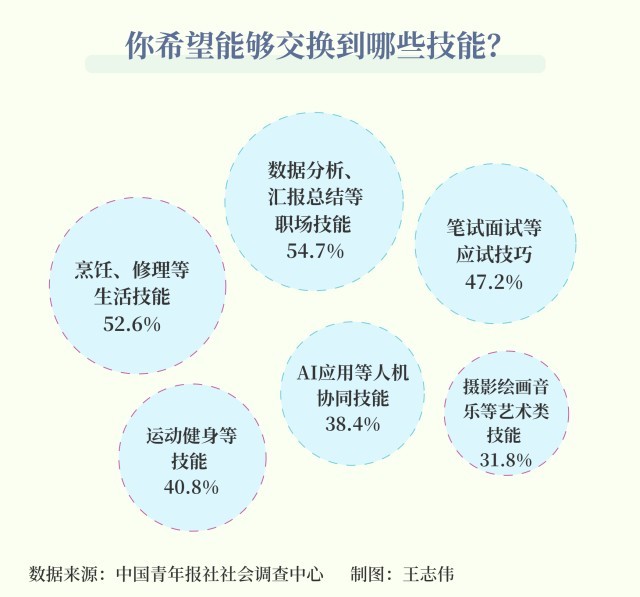 哪些是年轻人更想交换到的技能?调查显示,数据分析、汇报总结等职场技能(54.7%)、烹饪、修理等生活技能(52.6%)排在前两位,获选率均超过半数。此外,47.2%的受访青年希望交换笔试面试等应试技巧,40.8%的受访青年希望交换运动健身等技能。其他还有:AI应用等人机协同技能(38.4%),摄影绘画音乐等艺术类技能(31.8%),外语、方言等语言类技能(22.2%)。