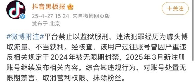 4月27日下午,抖音黑板报官方微博发布声明:“平台禁止以监狱服刑、违法犯罪经历为噱头博取流量、不当获利。经核查,该用户过往账号曾因严重违反相关规定于2024年被无限期封禁,2025年3月新注册账号继续发布相关内容。综合其违规行为,对账号处置无限期禁言、取消营利权限、抹除粉丝。”