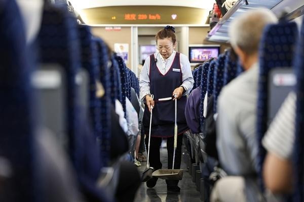 5月1日,西安北至武威东D2719次列车,保洁员正在打扫车厢。