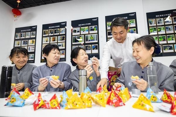 4月29日,“五一”国际劳动节前夕,湖北武汉长江中心小区里,保洁阿姨在专用休息室参加物业举办的茶话会。本文图片均由视觉中国提供