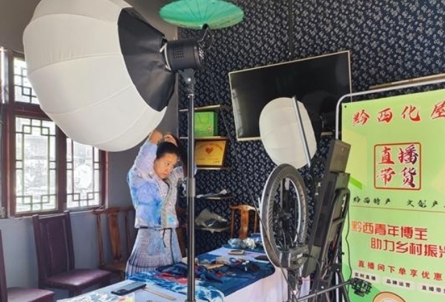 贵州省毕节市黔西市文丽蜡染刺绣非遗工坊带头人杨文丽正在准备直播。中青报·中青网记者 蒋肖斌/摄